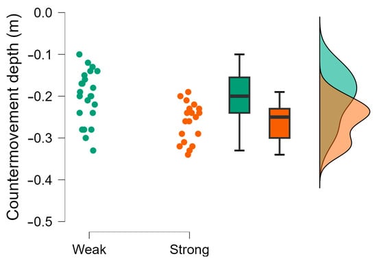 CMJ countermovement depth (m) raincloud plot with individual data points, box and whisker plots presenting median, interquartile range, and normal distribution for weaker and stronger groups. Green dots refer to individual data points for weaker players; Orange dots refer to individual data points for stronger players.