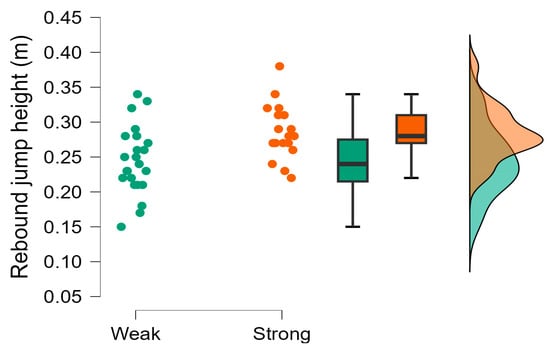 Rebound jump height (m) raincloud plot with individual data points, box and whisker plots presenting median, interquartile range, and normal distribution for weaker and stronger groups.