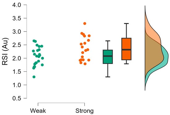 Reactive strength index (RSI, Au) raincloud plot with individual data points, box and whisker plots presenting median, interquartile range, and normal distribution for weaker and stronger groups.