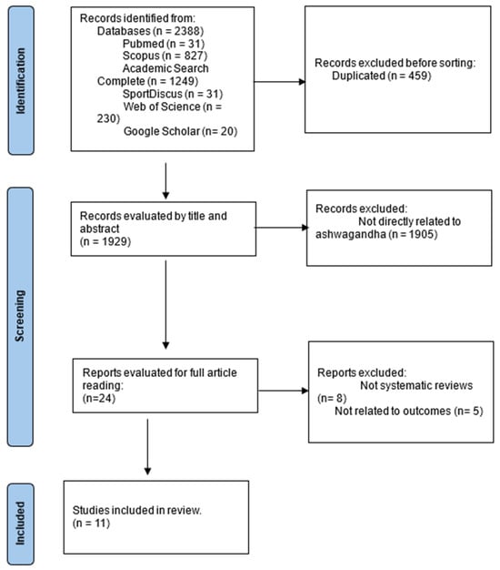 In total, 2388 records were identified in the above databases. Of these, 459 were excluded for being duplicates, leaving 1929. Next, 1905 was removed because they were not related to Ashwagandha. Finally, the 24 articles were assessed, and it was found that eight were not systematic reviews and that five were not related to the intended outcomes. In short, 11 articles met the criteria. The flowchart in Figure 1 summarizes the selection process.