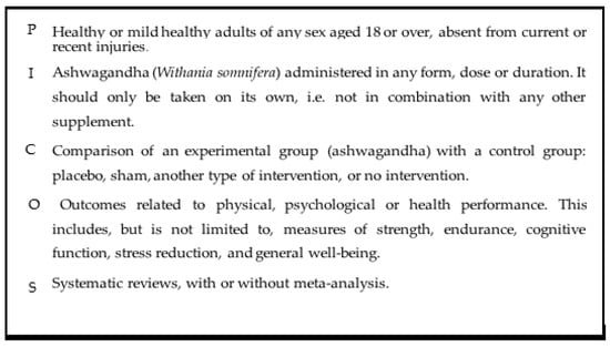 In July 2024, a search was conducted with the aim of identifying systematic reviews that evaluated the effect of Ashwagandha on physiological parameters related to sports performance. The electronic databases used for this search were PubMed, Scopus, Academic Search Complete, SportDiscus, Web of Science, and Google Scholar. The eligibility of the article was assessed using the PICOS (Population, Intervention, Comparator, Outcomes, and Study Design) framework, described in Figure 2.