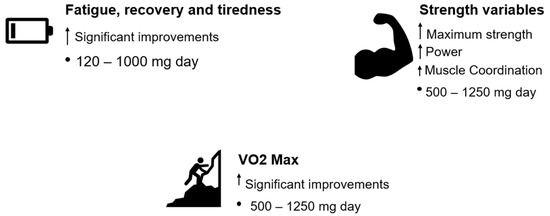 Overview of sports performance-related outcomes and the amount of supplementation needed per day. Mg—milligrams; ↑—improvements. Fatigue, recovery and tiredness—[19]; VO2Max—[29,31,36,37,38,39,40,75]; Strength variables—[69,70,71,72,73,74].