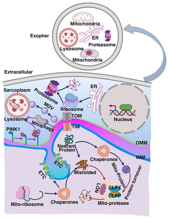 Overview of the Mitochondrial Protein Quality Control System. Abbreviation: ATP, Adenosine Triphosphate; CLPP, Caseinolytic Mitochondrial Matrix Peptidase Proteolytic Subunit; CLPX, Caseinolytic Mitochondrial Matrix Peptidase Chaperone Subunit; ER, Endoplasmic Reticulum; ETC, Electron Transport Chain; IMM, Inner Mitochondrial Membrane; LON, LON Protease; MDV, Mitochondrial-Derived Vesicle; Mito-ribosome, Mitochondrial Ribosome; OMM, Outer Mitochondrial Membrane; PINK1, PTEN-Induced Putative Kinase 1; TIM, Translocase of the Inner Membrane; TOM, Translocase of the Outer Membrane [43,44,45,46,47,48,49,50,51,52,53,54,55,56,57,58,59,60,61,62,63,64,65,66,67,68,69,70,71,72]. Mitochondria maintain proteostasis through a series of coordinated mechanisms, including the proteasome, autophagy, lysosomal degradation, mitophagy, mitochondrial-derived vesicles (MDVs), and the exopher pathway. Within mitochondria, nascent proteins are synthesized by the mitochondrial ribosome (Mito-ribosome) and folded with the assistance of molecular chaperones. Misfolded or damaged proteins are degraded by mitochondrial proteases such as LON and the CLPP–CLPX complex or exported for cytosolic degradation. The PQC system also involves the import of nuclear-encoded proteins via the translocase of the outer (TOM) and inner (TIM) mitochondrial membranes. Damaged or dysfunctional mitochondria are removed by mitophagy, a process regulated by PINK1 and lysosomal machinery. Alternatively, MDVs bud from mitochondria to transport damaged contents to lysosomes [42,43,44,45,46,47,48,49,50,51,52,53,54,55,56,57,58,59,60,61,62,63,64,65,66,67,68,69,70,71,72,73,74,75,76,77]. The exopher pathway facilitates the extrusion of damaged organelles and protein aggregates for extracellular clearance [78,79,80]. Together, these pathways coordinate mitochondrial protein turnover and help preserve mitochondrial integrity and function.