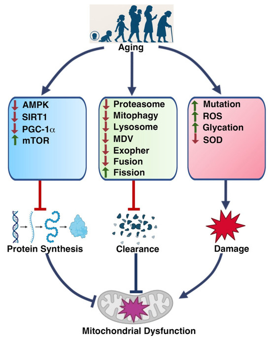 During aging, decreased activity of (AMP Activated Protein Kinase), SIRT1 (Sirtuin 1), and PGC-1α (Peroxisome Proliferator Activated Receptor Gamma Coactivator 1a), along with increased mTOR (Mechanistic Target of Rapamycin) signaling, leads to reduced mitochondrial protein synthesis. Additionally, dysfunction of the proteasome, autophagy–lysosome system, mitochondrial-derived vesicles (MDVs), exophers, and mitochondrial dynamics (fusion and fission) collectively impairs the clearance of damaged mitochondrial components [77,82,87,88,89,90]. Moreover, elevated levels of ROS (reactive oxygen species), increased glycation, accumulation of genetic mutations, and reduced antioxidant defenses such as superoxide dismutase (SOD) further compromise mitochondrial integrity and function [91,92,93,94,95]. These age-related disruptions—encompassing impaired mitochondrial biogenesis, altered dynamics, elevated oxidative stress, and maladaptive stress responses [96,97], ultimately contribute to the progressive decline in skeletal muscle function.