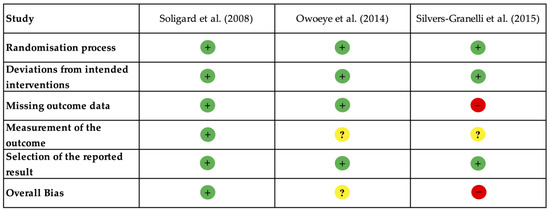 Risk of bias assessment for the included studies using the Revised Cochrane Risk of Bias Tool (RoB 2) [24]. Symbols indicate levels of bias: low risk (+), some concerns (?), and high risk (−). The included studies are Soligard et al. [16], Owoeye et al. [30], and Silvers-Granelli et al. [18].