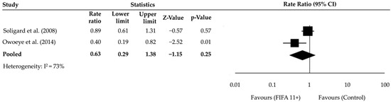 The primary effect measure was the RR to analyse ankle injury incidence per 1000 exposure hours. The rate ratio was calculated by comparing the incidence of ankle injuries between the intervention group (FIFA 11+ programme) and the control group (standard warm-up). This allowed for comparing the relative reduction in ankle injury incidence associated with the FIFA 11+ programme. The meta-analysis synthesised the RRs across studies, and 95% confidence intervals (CIs) were employed to indicate the precision of the estimates. An RR of 1 indicates no difference in injury rates between the groups, whereas values less than 1 suggest a reduced injury rate, and values greater than 1 indicate an increased injury rate [25].