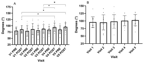 (A) ROM achieved to the point of discomfort pre- and post-static stretching at 120% of the point of discomfort. (B) Static stretching degrees for the 120% point of discomfort for the five visits. * Different p < 0.05. Data presented as group mean and standard deviation with individual responses.