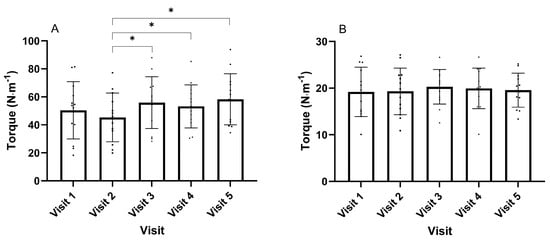 The peak torque achieved during the stretch was different over time (F(4, 48) = 3.675, p = 0.011, ηp2 = 0.234), with the torque achieved in visit two being lower than visits three (p = 0.017), four (p = 0.022) and five (p = 0.006) (Figure 2A). Following the stretching, the gravity-corrected passive stiffness achieved was not different across the visits (F(4, 48) = 0.492, p = 0.742) (Figure 2B).