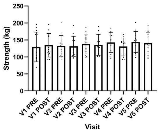 There was no difference in the MVC produced before the high-intensity static stretch across the visits (F(2.352, 28.331) = 1.494, p = 0.241). Similarly, the MVC produced following the 30 s high-intensity stretch was also not different across the visits (F(4, 48) = 0.761, p = 0.556) (Figure 3). The Δ change in strength for pre-to-post-static stretch from each visit was different (F(4, 48) = 3.227, p = 0.020, ηp2 = 0.212) (V1: Δ5.2 ± 17.8, V2: Δ-1.2 ± 11.8, V3: Δ-2.6 ± 9.1, V4: Δ-12.0 ± 12.1, V5-3.5 ± 9.9 Kg), with changes following visits one and four (p = 0.003), two and four (p = 0.025), three and four (p = 0.049) and four and five (p = 0.026).
