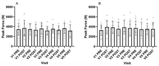 The peak force from the 20 cm drop single-leg vertical jump before stretching was not different (F(4, 48) = 0.206, p = 0.934) (Figure 4A), and neither was the peak force achieved on the fourth maximal single-leg jump (F(4, 48) = 1.536, p = 0.207) (Figure 4B). Following the high-intensity SS, similarly, the peak force during the drop jump was not different (F(4, 48) = 1.389, p = 0.252) (Figure 4A), and neither was the peak force achieved on the fourth jump (F(4, 48) = 0869, p = 489) (Figure 4B).