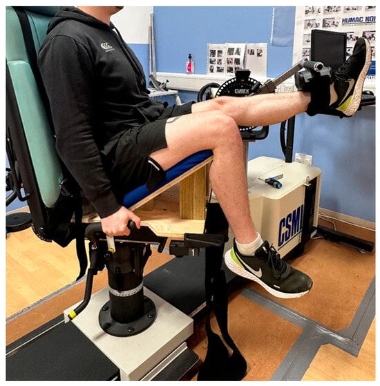 Participants were seated on an isokinetic dynamometer in a hip-flexed position, which has been shown to allow for a sufficient stretch of the hamstrings [27] (Figure 5). To achieve this position, the angle between the backrest and seat of the isokinetic dynamometer was set to 60°, with hip and chest straps used to prevent additional movement. The lateral epicondyle of the knee was aligned with the axis of rotation of the lever arm of the isokinetic dynamometer. To aid the set up and to identify bony landmarks, the participants were required to wear shorts for testing visits. The seating position setup was recorded on the first visit and replicated for all subsequent visits. The participants’ dominant leg was then passively extended by the primary investigator to 120% greater than the angle achieved in the pre-intervention ROM test (see Section 4.5); this position was then held for 30 s, with the participants being instructed to relax. Immediately following the 30 s stretch, the participants were asked to mark on a 100 mm visual analogue scale how they perceived the stretch from “No pain at all” to “worst pain imaginable”. For data interpretation, the participant’s mark was measured from 0 to 100 mm, with the interpretation that the higher the score, the higher the participant’s rated intensity of the stretch.