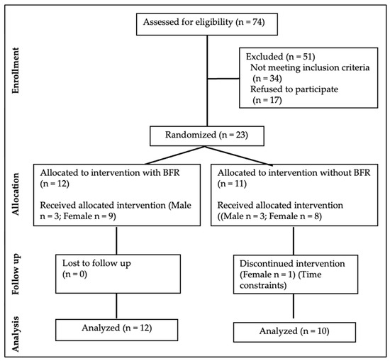 Seventy-four individuals responded to the questionnaire and forty were eligible to participate in the study. Twenty-three accepted to participate in the study, twelve in the BFR group and eleven in the High-load group (without BFR). One participant in the High-load group dropped out after two sessions (Figure 1).