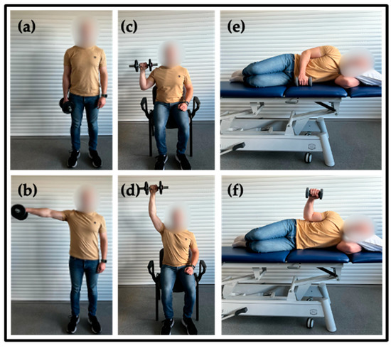 - Shoulder Lateral Rotation: Performed lying on a bench. Participant was seated with the arm resting against the torso and the elbow flexed at 90°. The movement involved performing shoulder external rotation (Figure 2e,f).