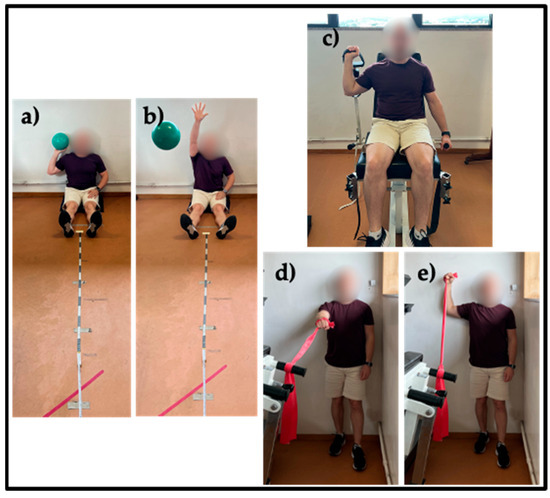 The Shoulder Endurance Test (SET) was chosen to evaluate shoulder muscle endurance due to its controlled pace. Participant stood with his back against a wall, the contralateral heel touching the wall, and the ipsilateral leg positioned forward. Movement involved abducting the shoulder to 90° and externally rotating to 90° while touching the wall. Resistance was applied using a red elastic band. The distance between the hand and elastic anchor was fixed at 1 m. A metronome was used to guide movement cadence from 60 bpm, increasing by 30 bpm every 20 s, until 150 bpm. The test ended when participants failed to maintain pace or movement quality [33]. Test duration was recorded in seconds (Figure 3d,e).