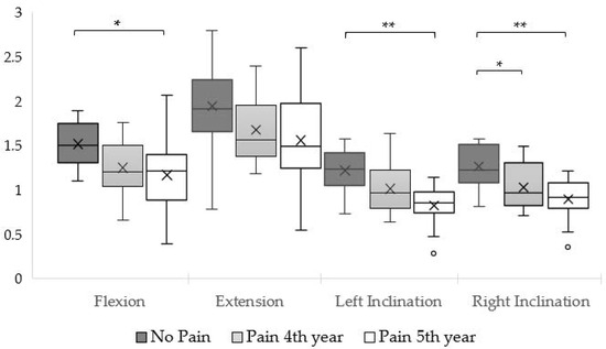 - Ylinen, J.; Takala, E.-P.; Kautiainen, H.; Nykänen, M.; Häkkinen, A.; Pohjolainen, T.; Karppi, S.-L.; Airaksinen, O. Association of neck pain, disability and neck pain during maximal effort with neck muscle strength and range of movement in women with chronic non-specific neck pain. Eur. J. Pain 2004, 8, 473–478. [Google Scholar] [CrossRef]