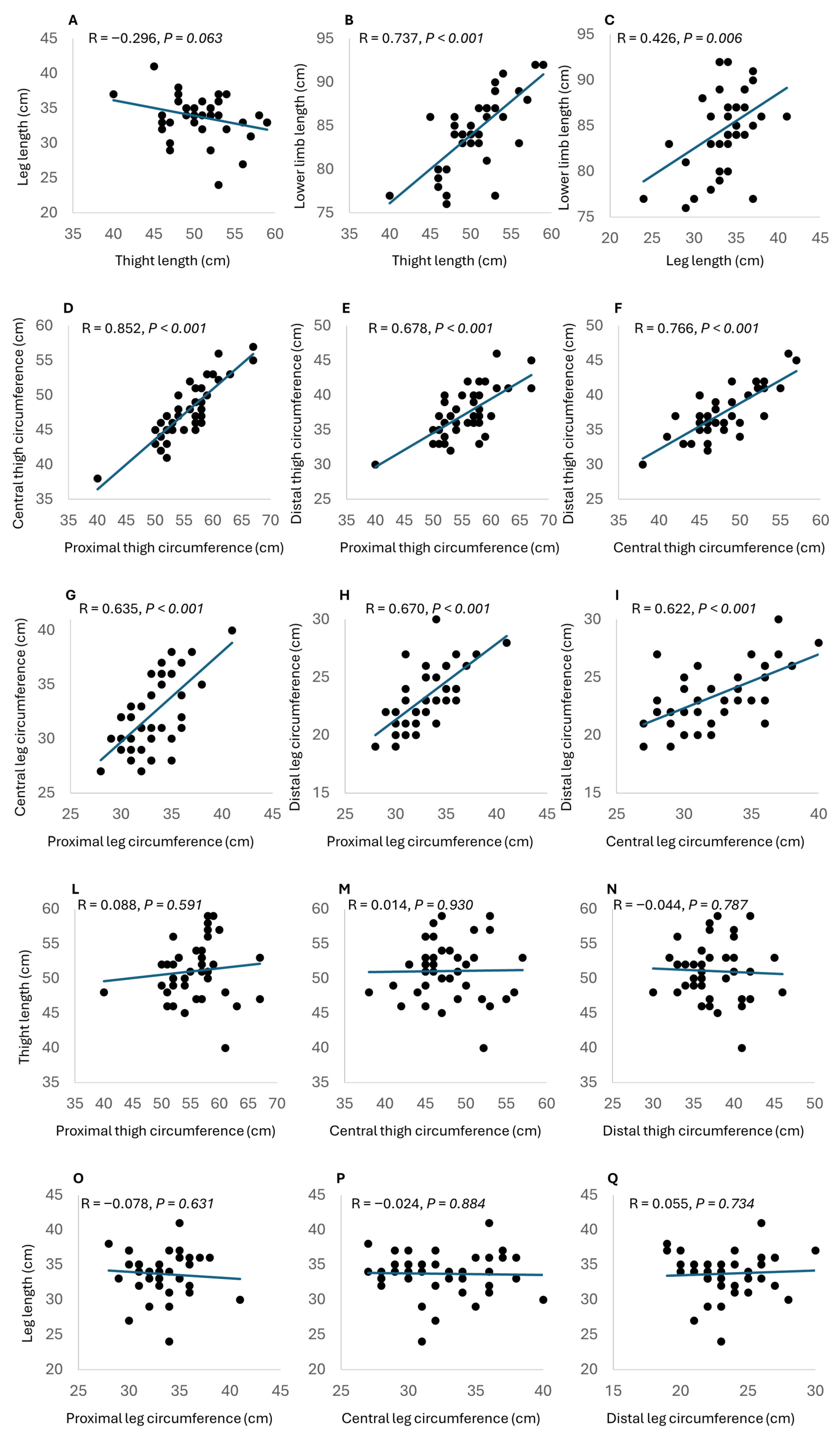 Panels (A–C): Scatter plots for the relationship (black dots) between leg length and thigh length (A), lower limb length and thigh length (B), and lower limb length and leg length (C). The correlation between the variables is represented by the regression line (blue line). Panels (D–F): Scatter plots for the relationship (black dots) between central thigh circumference and proximal thigh circumference (D), distal thigh circumference and proximal thigh circumference (E), and distal thigh circumference and central thigh circumference (F). The correlation between the variables is represented by the regression line (blue line). Panels (G–I): Scatter plots for the relationship (black dots) between central leg circumference and proximal leg circumference (G), distal leg circumference and proximal leg circumference (H), and distal leg circumference and central leg circumference (I). The correlation between the variables is represented by the regression line (blue line). Panels (L–N): Scatter plots for the relationship (black dots) between thigh length and proximal thigh circumference (L), central thigh circumference (M), and distal thigh circumference (N). The correlation between the variables is represented by the regression line (blue line). Panels (O–Q): Scatter plots for the relationship (black dots) between leg length and proximal leg circumference (O), central leg circumference (P), and distal leg circumference (Q). The correlation between the variables is represented by the regression line (blue line).