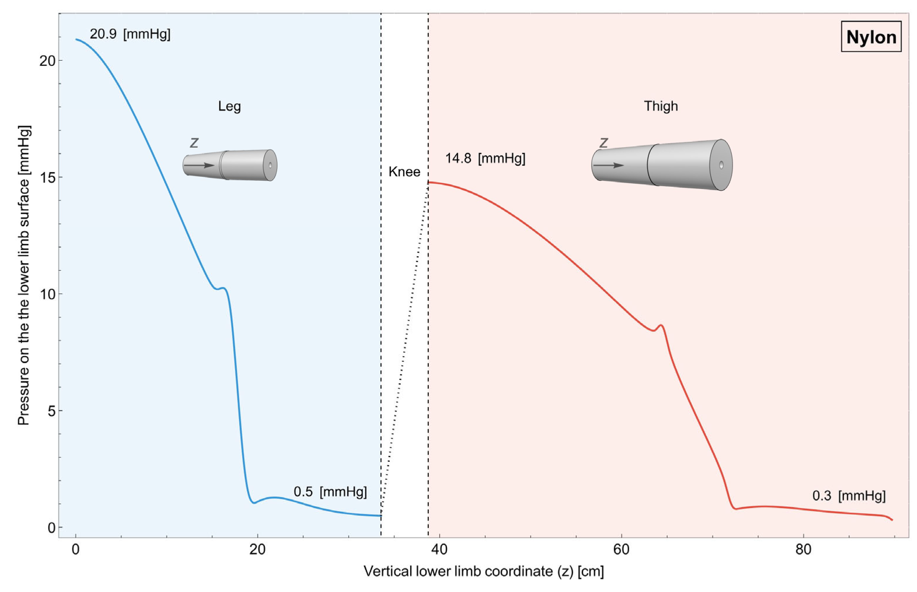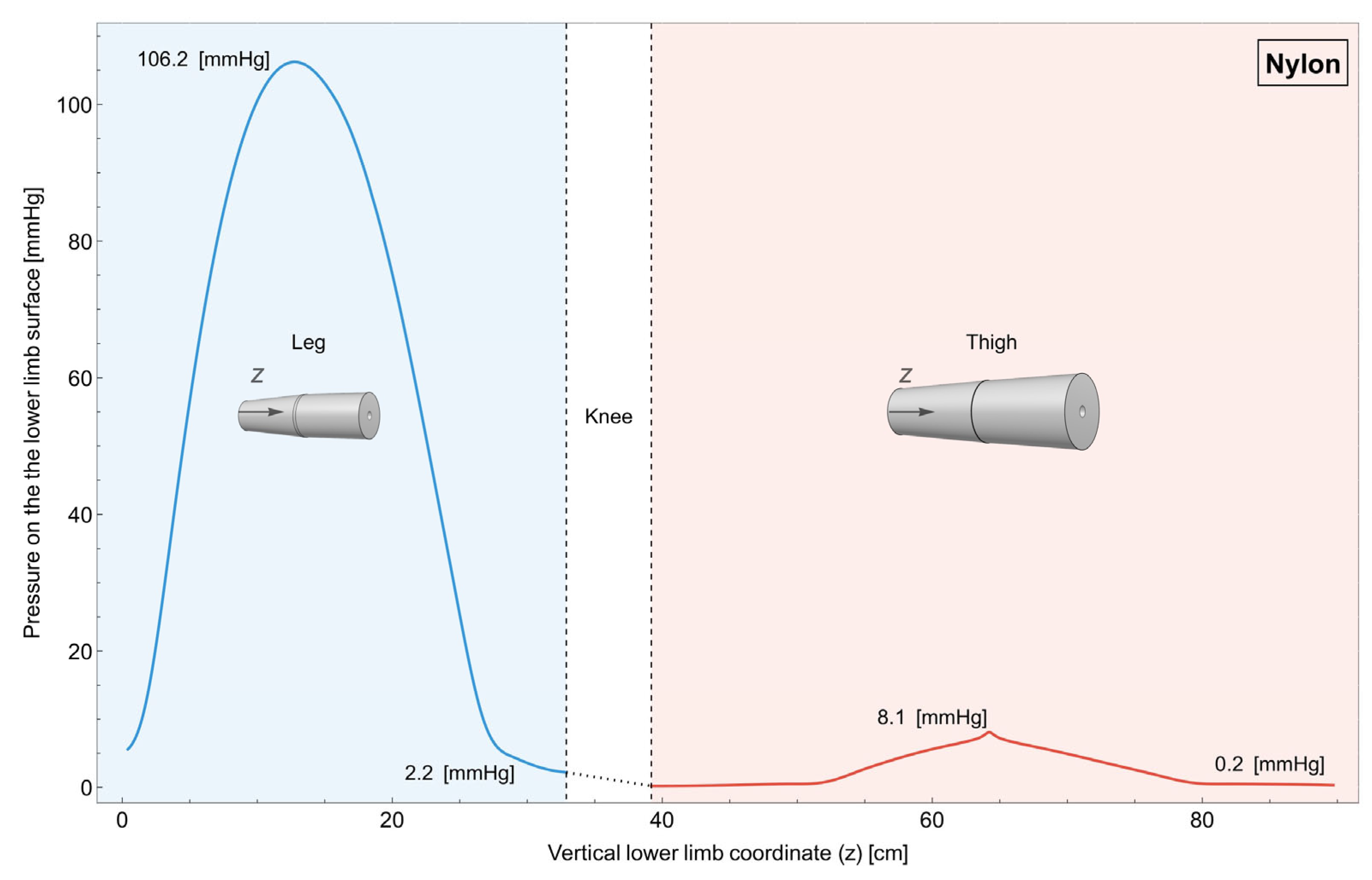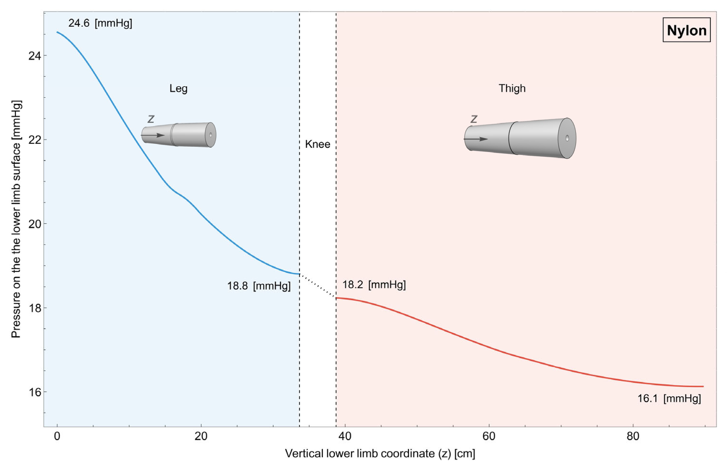 Individual linear progression garment made of nylon. Variation in pressure on the surface of the lower limb along its length. It can be observed that it is possible to tune the pressure in the distal part of both the leg and the thigh while keeping a decreasing value for the pressure. In order to keep reasonable pressure in the distal part, the contact between the garment and the proximal part is lost.