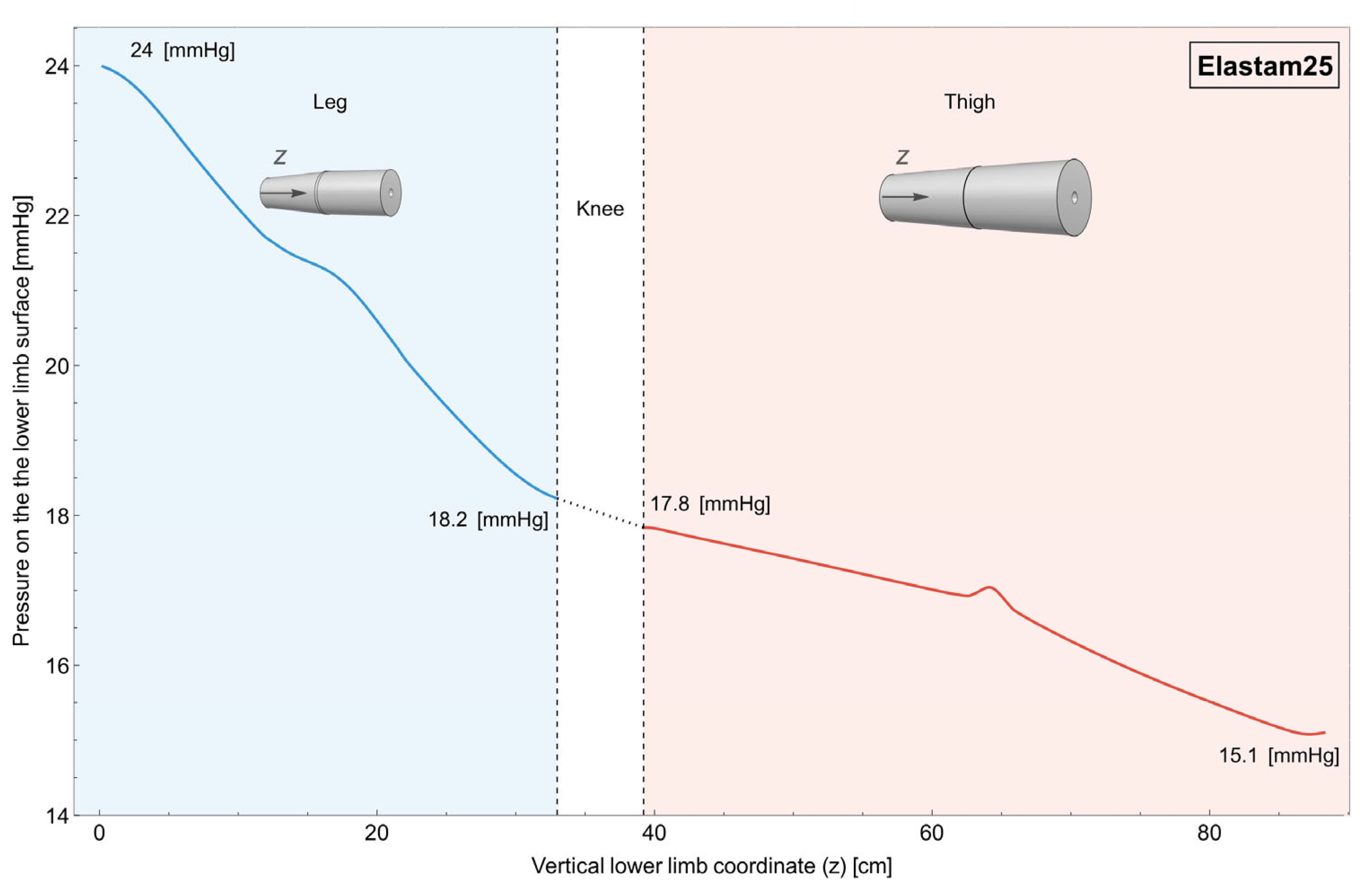 Figure 8 (Elastam25). This design allows for a more targeted application of compression with the ability to adjust pressure levels differentially for the thigh and lower leg, ensuring optimal compression and tangible benefits. The minimum pressure, obtained by the simulation on the upper part of the thigh, varies around 15–16 mmHg, depending on the material set, ensuring that the minimal pressure has a positive effect on local hemodynamics [