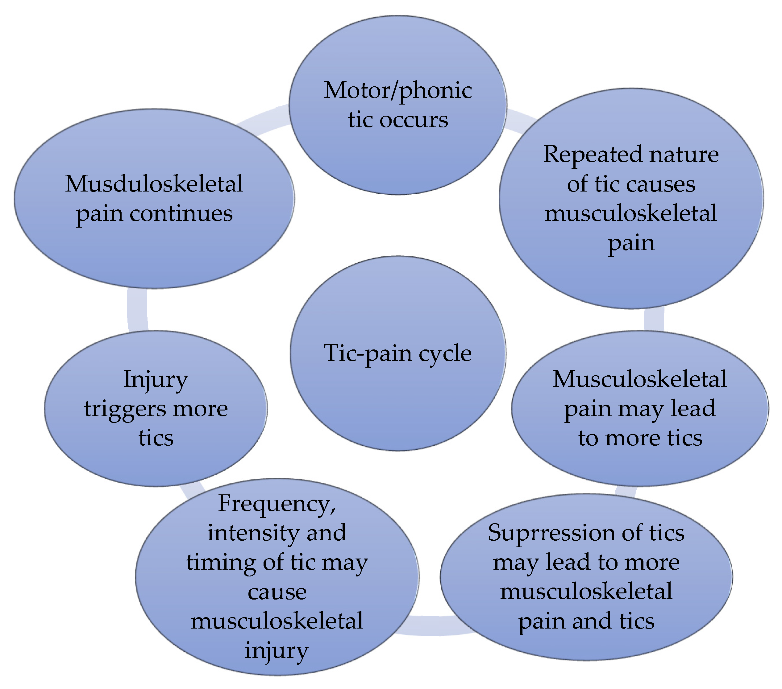 - Green, B.; Waters, A.; Jimenez-Shahed, J. Pain in Tourette Syndrome: A Comprehensive Review. J. Child Adolesc. Psych. 2025, 35, 23–36. [Google Scholar] [CrossRef] [PubMed]