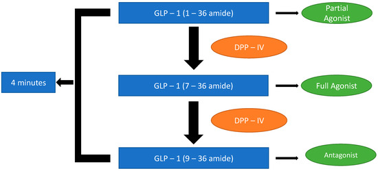 6]. As a result of the distinctive processing of its precursor glucagon, GLP-1 occurs in two active forms: GLP-1 (7–37 amide) and GLP-1 (7–36 amide). GLP-1 (7–36 amide) is the primary circulatory form, which exerts insulinotropic and glucoregulatory functions. However, within 1 to 4 min of secretion, both active forms are degraded by dipeptidyl peptidase 4 (DPP-IV) through cleavage of NH2-terminal amino acids to their respective principal metabolites; 9–37 amide and 9–36 amide (