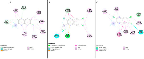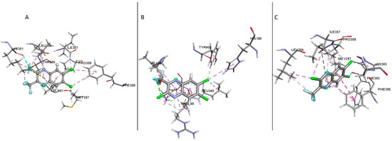 Figure 5A). Most of these residues were hydrophobic amino acids except for Thr355 and Lys351; both are polar and positively charged, respectively. In the inactive structure 5VEW, the following residues were present in the binding site (