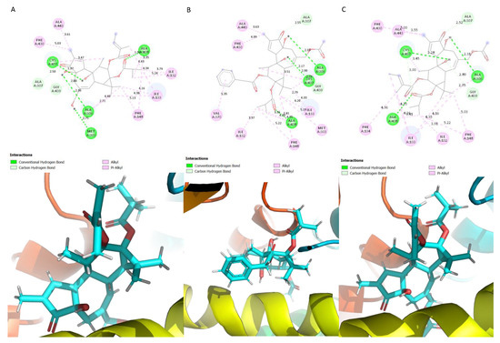 The ligands P-12Ang-13iBu, P-20Ac-12AcPh-13iBu and P-20Ac-12Ang-13iBu interacted with non-polar residues, bar the residue Cys 437 which is polar (Figure 3). The ligand P-12Ang-13iBu formed a carbon–hydrogen interaction with the residues Ala 307 and Gly 439 (Figure 3A). Hydrogen bonds were also formed with Cys 437, Ala 438, Ala 306 and Met 303 (Figure 3A). Hydrogen bonds were formed with Ala 438, Cys 437 and Ala 306 and the phorbol diester P-20Ac-12AcPh-13iBu (Figure 3B). Ala 307 and Gly 439 formed carbon hydrogen interactions with the ligand; the rest of the interacting residues formed alkyl and pi-alkyl interactions (Figure 3B). Ala 307 and Gly 439 formed carbon hydrogen bonds with the ligand, Ala 438, Cys 437 and Ala 306 formed hydrogen bonds with the phorbol diester P-20Ac-12Ang-13iBu (Figure 3C).