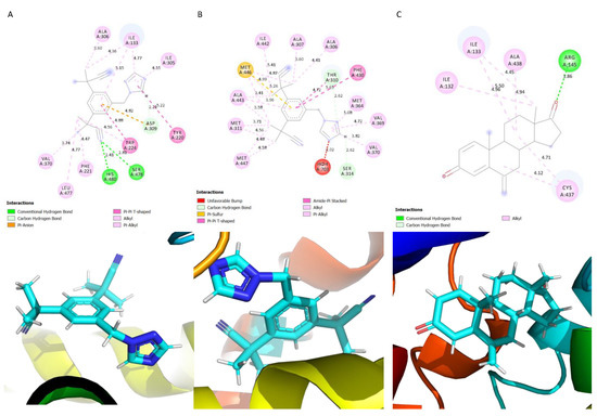 Schematic showing the protein–ligand interactions. (A) Anastrozole, (B) Letrozole, (C) Exemestane.