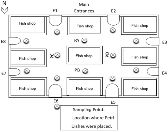 Twelve sampling points were selected within the total area of the sea market facilities (Figure 2). At each sampling point, at a height of 1 m, Petri dishes with culture media were placed in duplicate for the analysis of aerobic mesophiles, coliforms, fungi, and yeast. The Petri dishes were kept open for 1 h and then closed and incubated. During sampling, Petri dishes with closed culture medium were also placed and incubated under similar conditions to act as a control.