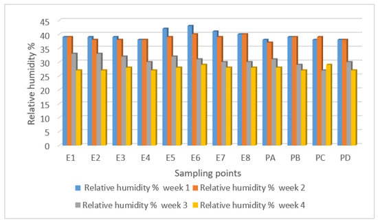 Analysis of relative air humidity at each sampling point in processing and marketing areas. E1, entrance 1; E2, entrance 2; E3, entrance 3; E4, entrance; E5, entrance 5; E6, entrance 6; E7, entrance 7; E8, entrance 8; PA, corridor A; PB, corridor B; PC, corridor C; and PD, corridor D.