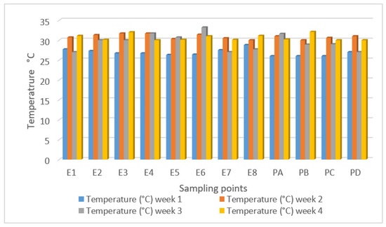 During the four weeks of the study, the temperature and relative humidity of the fishery product processing and marketing area were assessed at each sampling point, with the following results: in week 1, the average ambient temperature was 26.8 ± 0.8 °C and the relative humidity was 39.5 ± 1.6%; in week 2, the temperature was 30.8 ± 0.5 °C and the relative humidity was 38.6 ± 0.8%; in week 3, the temperature was 29.4 ± 2 °C and the relative humidity was 30.6 ± 1.7%; and in week 4, the temperature was 0.6 ± 0.7 °C and the relative humidity was 27.7 ±0.7%. The highest average relative humidity and the lowest average environmental temperature were observed in the first week of the study. Point E6 in week 1 had the highest relative humidity (43%); the lowest values were recorded at PA and PB in week 3, with 29 and 27%, respectively (Figure 4). The highest environmental temperature was recorded at point E6 in week 3 (33.3 °C), and the lowest temperature (23 °C) was recorded at sampling points PA, PB, and PC in week 1 (Figure 5).