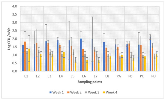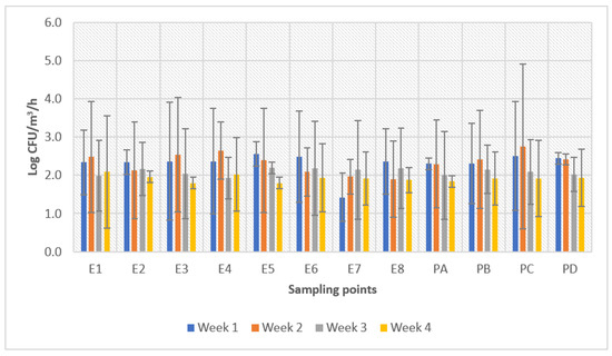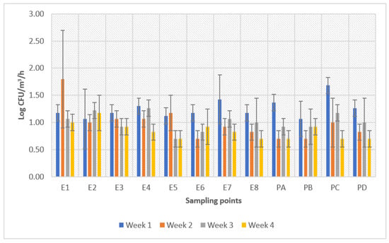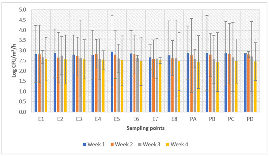 The highest values were at the PD sampling point (2.11 log CFU/m3/h), followed by points E6 (2.01 CFU/m3/h), E7 (1.98 CFU/m3/h), E4 (1.94 CFU/m3/h), E5 (1.91 CFU/m3/h), and E3 (1.85 CFU/m3/h) in week 1 and sampling point E1 (log 1.82 CFU/m3/h) in week 2. During week 4, sampling points E5, E6, and E7 had the lowest counts among all the sampling points (0.7 log CFU/m3/h) (Figure 9).