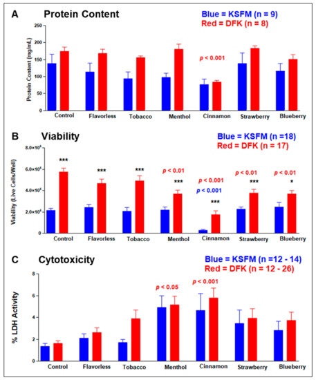 Effects of e-liquids ± flavors on OKF6/TERT-2 cells growing in KSFM or DFK. Total protein content (A), cellular viability (B), and cytotoxicity (C) were measured, and each bar indicates their means ± SE. * = p < 0.05 and *** = p < 0.001 when comparing KSFM vs. DFK within each treatment in three separate experiments. The p values in blue and red signify statistical significance between control and treatment groups for either KSFM or DFK, respectively.