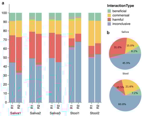 Stacked bar and pie charts of host–microbe interaction types in each microbiome replicate. (a) The stacked bars visually depict the species diversity within each replicate, with classification into beneficial, harmful, or commensal categories in the host microbiome based on existing literature. Any microbial species that have missing or conflicting information is categorized as inconclusive. (b) The pie charts depict the same classification of host–microbe interaction, with mean percentages for each interaction type within the saliva and stool samples. Components may not sum to totals because of rounding.