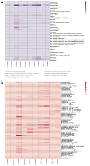 The Comprehensive Antibiotic Resistance Database (CARD) resistance ontology in each microbiome replicate based on (a) antibiotic category and (b) taxon conferring resistance to antibiotics. Antibiotics are classified based on their mechanism of action, spectrum of activity, or chemical structure. The antibiotic category shows all resistance pathways linking the gene to antibiotic molecules. The heatmap scale shows the number of alignments to the antibiotic category or the taxon conferring resistance to antibiotics.