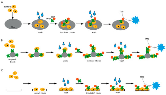 In summary, considering the high affinity of streptavidin to the cell membrane of bacteria, we explored various assays to detect bacteria. We faced different limitations with this approach as high background signals due to the unspecific binding of HRP to, e.g., magnetic beads.