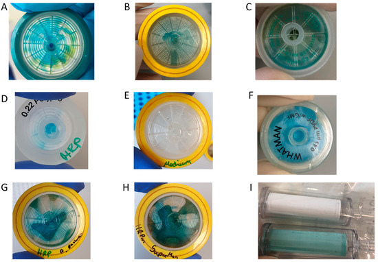 Bacterial cells were grown overnight in a 2xYT medium. The next day, the cells were adjusted to OD600 of 1 with PBS. This corresponds to a concentration of 109 cells/mL. 10-fold serial dilutions were prepared in PBS, and 1 mL of each concentration was applied to different syringe filters made with PVDF-, PES- or polypropylene-membrane. The filter was washed three times by passing 1 mL PBS through the filter. HRP-conjugated streptavidin (HRP-Strep, N100/Thermo Fisher Scientific, Waltham, MA, USA) was prepared in a 1:104 dilution in PBS, and 1 mL was used to apply on the filter. Then, the filter is incubated for 1 h at room temperature (RT). Subsequently, the filters were washed five times with 10 mL PBS. Finally, 1 mL TMB substrate solution (1-step ultra TMB-ELISA substrate solution, Thermo Fisher Scientific, Waltham, MA, USA) was passed through each filter. The filters were incubated for 10 min at RT before the development of a blue color was observed and a picture was taken.