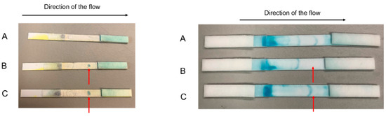 Briefly, bacterial cells were first grown overnight in TSB media. The next day, the cells were adjusted to OD 600 of 1 using 0.1 M sodium phosphate buffer, pH 7.4 (PBS), corresponding to a concentration of ~109 cell/mL. 10-fold bacterial serial dilution was prepared in PBS to a final volume of 1mL in PBS. Lateral flow dipsticks already prefabricated at AIT made of Nitrocellulose were used. Briefly, a drop of a suspension of bacteria in PBS at different concentrations was pipetted on different nitrocellulose dipsticks. The dipsticks were incubated at room temperature for 1 h to let the PBS evaporate, and the bacteria stuck to the nitrocellulose dipstick. 1 mL of PBS was running through the dipstick from left to right (direction of the flow). Subsequentially, HRP-conjugated streptavidin (N100/ThermoFisher Scientific, Waltham, MA, USA) was prepared in a dilution range of 1:104 in PBS, and 1 mL of it was running through the dipstick in the direction of the flow. 3 to 5 washing steps were then made by running 1 mL of PBS in the direction of the flow. TMB substrate solution (1 mL; 1-step ultra TMB-ELISA substrate solution, ThermoFisher Scientific, 34028, Waltham, MA, USA) was running through the dipstick in the direction of the flow. After 10 min of incubation at room temperature, the filters were inspected, and the development of blue color was observed. If the bacterial cells were detected after 10 min of incubation at room temperature, a formation of blue color was observed where the cells were pipetted. Negative control was prepared by following all the previous steps but without the addition of bacterial cells.