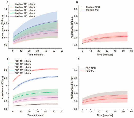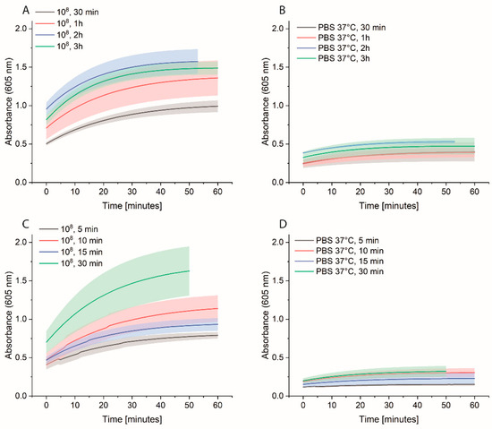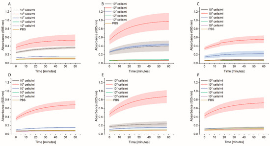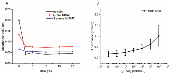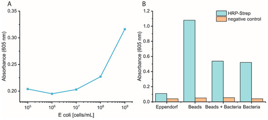 Bacterial cells were prepared as described previously. On the day of the experiment, a 10-fold dilution of bacteria in PBS was prepared, and 1 mL was distributed in either normal Eppendorf tubes (EP0030120086) or low-binding Eppendorf tubes (EP0030108116). Streptavidin magnetic beads (SMB, 11641778001, Merck KGaA, Darmstadt, Germany) were washed three times with PBS, and then a 1:10 dilution of the beads was prepared. Each bacterial dilution was mixed with 100 µL diluted SMB and shaken at 700 rpm for 1 h at RT. Then, the supernatant was removed, and the beads were washed three times with 1 mL PBS. Afterwards, 1 mL of 0.1 µM HRP-Strep was added and shaken at 700 rpm for 1 h at RT. The beads were washed thrice with 1 mL PBS, then 200 µL TMB was added. Finally, 100 µL supernatant was transferred into a 96-well plate, and absorbance was measured at 605 nm using a plate reader (EPOCH, Agilent Biotek, Santa Clara, CA, USA).