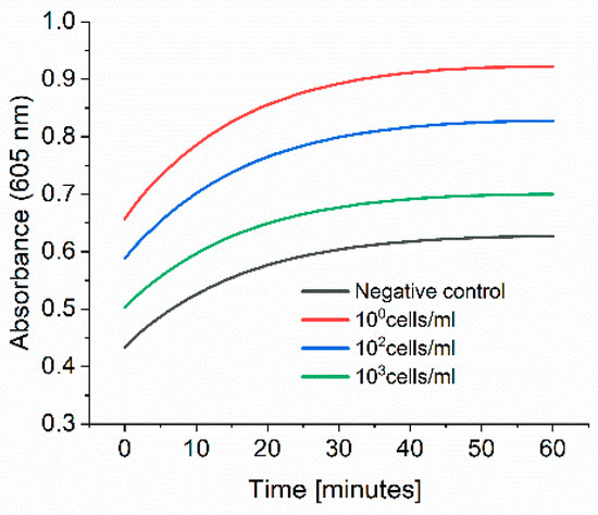 E. coli M/11407 was grown overnight at 37 °C in a 2xYT medium. Cells were then centrifuged and resuspended in tap water to an OD600 of 1. Different Eppendorf tubes were prepared to contain 100, 102 and 103 cell/mL in tap water. Each 1 mL of each cell concentration was added to 4 mL of 2xYT medium and incubated overnight at 37 °C. The day after, the cells were centrifuged and resuspended in 1 mL of PBS in Eppendorf tubes, which were then incubated at 37 °C for 3 h at 600 rpm. The cells were washed once with 1 mL PBS, and then 1 mL of 0.1 nM HRP-Strep was added and incubated for 1 h at RT at 600 rpm. The cells were washed with 2 × 1 mL of PBS and 200 µL TMB substrate solution was added. After 10 min incubation, 100 µL were transferred in a standard 96-well plate added, and absorbance was measured at 605 nm using a plate reader (EPOCH, Agilent Biotek, Santa Clara, CA, USA).