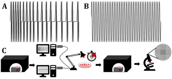 The two EMFs utilized in this study were Thomas (A) and 40 Hz (B); a representation of the procedure can be seen in (C).