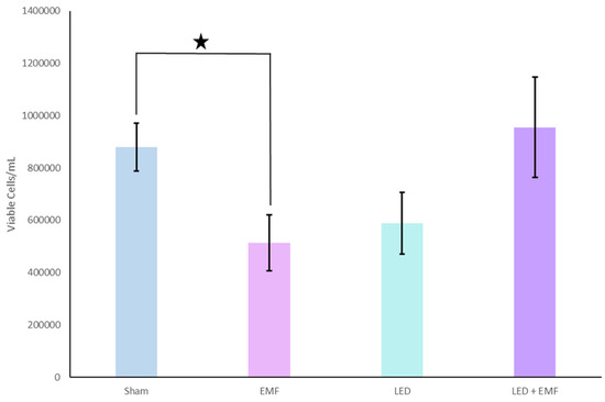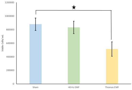 Number of viable cells for EMF alone condition. The Thomas EMF displayed significantly fewer numbers of viable cells compared to the sham controls (denoted by asterisk). Means and SEMs are presented.