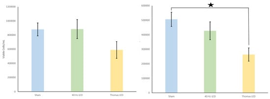 (left): Number of viable cells for LED alone condition. No significant differences were found. (right): Number of non-viable cells for the LED alone condition. The Thomas pattern applied as an LED produced significantly fewer non-viable cells when compared to the controls (denoted by asterisk). Means and SEMs are presented.
