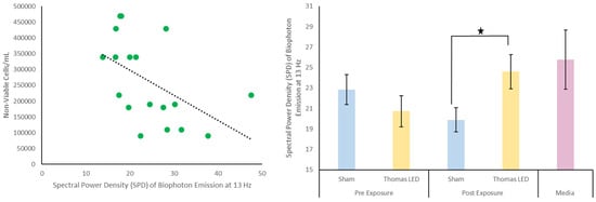 (left): Scatterplot of non-viable cell counts by SPD of biophoton emission at 13 Hz after exposure to a lone LED. (right): Spectral Power Density of biophoton emission at 13 Hz via LED condition. The only significant result was an increase in SPD at 13 Hz for the Thomas condition following LED exposure (denoted by asterisk).