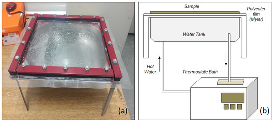 The lab-scale batch dryer utilizing refractance window (RW) technology, as employed in this study, is depicted in Figure 1. The apparatus comprised an aluminum reservoir (28.0 cm × 20.0 cm × 8.0 cm), filled with circulating hot water supplied by a thermostatic bath (Tecnal, TE-184, Piracicaba, SP, Brazil), operating within a closed system. The chosen support for this equipment was the polyester film Mylar® type D (DuPont, Wilmingron, DE, USA), with a thickness of 0.25 mm. The film was secured on the top of the reservoir frame, ensuring the complete contact of the film’s bottom surface with the hot water. The water temperature was regulated and monitored by the temperature control system of the thermostatic bath (±0.1 °C).