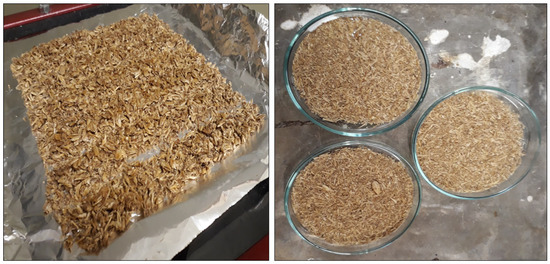 For each experiment, approximately 75.0 g of fresh brewer’s spent grain was utilized. The samples were arranged on an aluminum foil placed over the Mylar® film, which was divided into rectangles with 15.0 × 2.0 cm with a thickness of 0.50 cm, using a plastic support. The inclusion of aluminum foil aimed to ease the sample collection and facilitate the measurement of moisture level and kinetics during the tests. The samples were weighed during the experiments. This procedure has been previously employed successfully in the RW drying of other materials, and its application did not significantly impact the results [33].