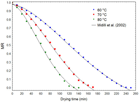 The estimated parameters and the analysis of variance of the drying kinetic models evaluated in this study are presented in Table 4. The model that most accurately represented the experimental data was the one by Midilli et al. [46], with a higher value of R2 and better statistical parameters. The results indicate that, for this model, as the temperature increased from 60 to 80 °C, the kinetic constant (k) demonstrated an increase of approximately 550%. This observation aligns with the understanding that this parameter is linked to the diffusivity of water through the material during the moisture removal process. It is well documented in the literature that diffusivity is highly influenced by temperature [49]. The kinetic curves obtained for the Midilli et al. [46] model are depicted in Figure 4.