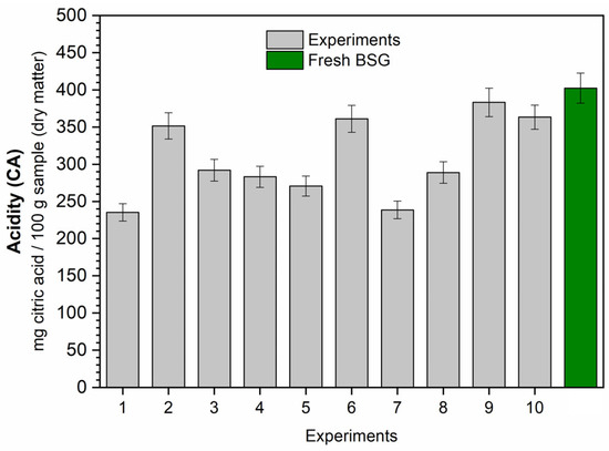 Acidity (CA) is characterized by the content of citric acid, an antioxidant compound and the most versatile acidulant used in the industry [55,56]. Although more commonly found in fruits and vegetables, citric acid is also present in brewer’s spent grain, emphasizing the significance of its evaluation [57,58].