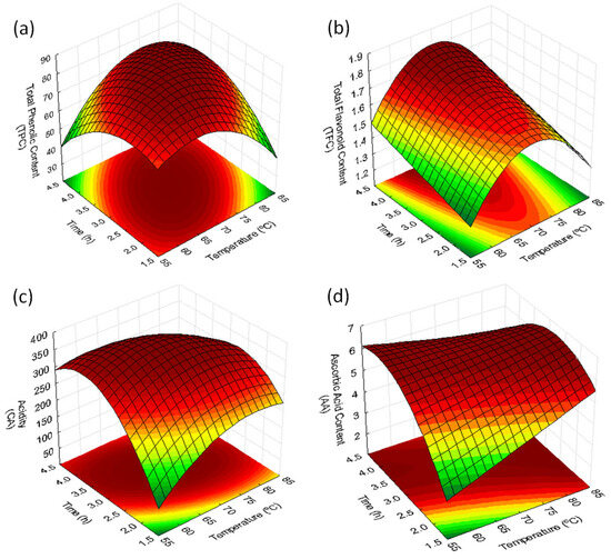 Equation (4) presents the fitted equation (R2 = 0.7695), highlighting the influence of both independent variables studied. The results demonstrate a quadratic effect of temperature (T) and a linear effect of the drying time (t). Figure 9b illustrates that the temperature range between 70 °C and 80 °C, when combined with longer drying times, has the optimal values for total flavonoid content (TFC).