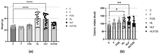 (a) Weights of the experimental groups expressed as the mean and standard deviation during the four months. (b) Comparison of the average caloric intake expressed as the mean and standard deviation per animal of each experimental group during the four months. C—control group; F—high-fiber normolipid diet group; FOS—normolipid diet with FOS group; HL—high-fat diet group; HLF—fiber-rich, high-fat diet group; HLFOS—high-fat diet group with FOS. FOS—fructooligosaccharide. * indicates significantly different (p = 0.003), ** indicates significantly different (p = 0.006), **** indicates significantly different (p < 0.0001). N = 60. Data are reported as mean ± SD.