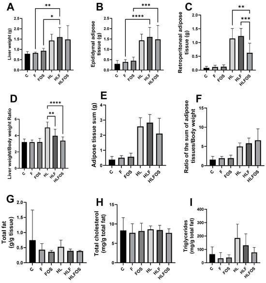 Comparison of liver and adipose tissue weights of each experimental group and liver lipid profile. C—control group; F—high-fiber normolipid diet group; FOS—normolipid diet with FOS group; HL—high-fat diet group; HLF—fiber-rich, high-fat diet group; HLFOS—high-fat diet with FOS group. FOS—fructooligosaccharide. (A) Liver weight; (B) Epididymal adipose tissue (g); (C) Retroperitoneal adipose tissue (g); (D) Liver weight/body weight ratio; (E) Adipose tissue sum (g); (F) Ratio of the sum of adipose tissues/body weight; (G) Total fat (g/g tissue); (H) Total cholesterol (mg/g total fat); (I) Triglycerides (mg/g total fat). * indicates significantly different (p < 0.02), ** indicates significantly different (p < 0.002), *** indicates significantly different (p < 0.0002), **** indicates significantly different (p < 0.0001). N = 60. Data are reported as mean ± SD.